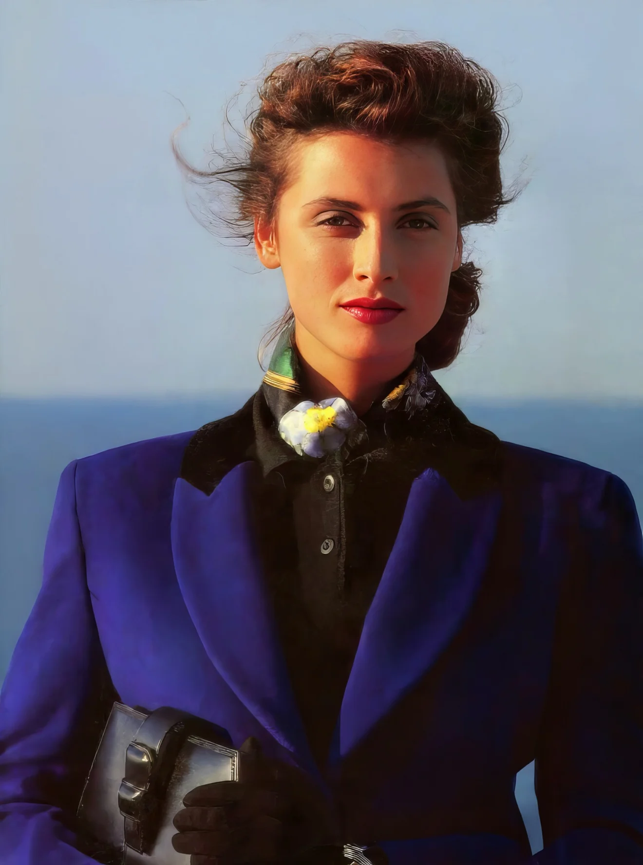 Lisa Graham, somewhere against a late-eighties coastline — cobalt blazer, exaggerated lapels, leather gloves, a single corsage holding it all together. Originally the cover of Marie Claire Spain, September 1988 — the kind of editorial that makes you wonder why anyone stopped dressing like this.