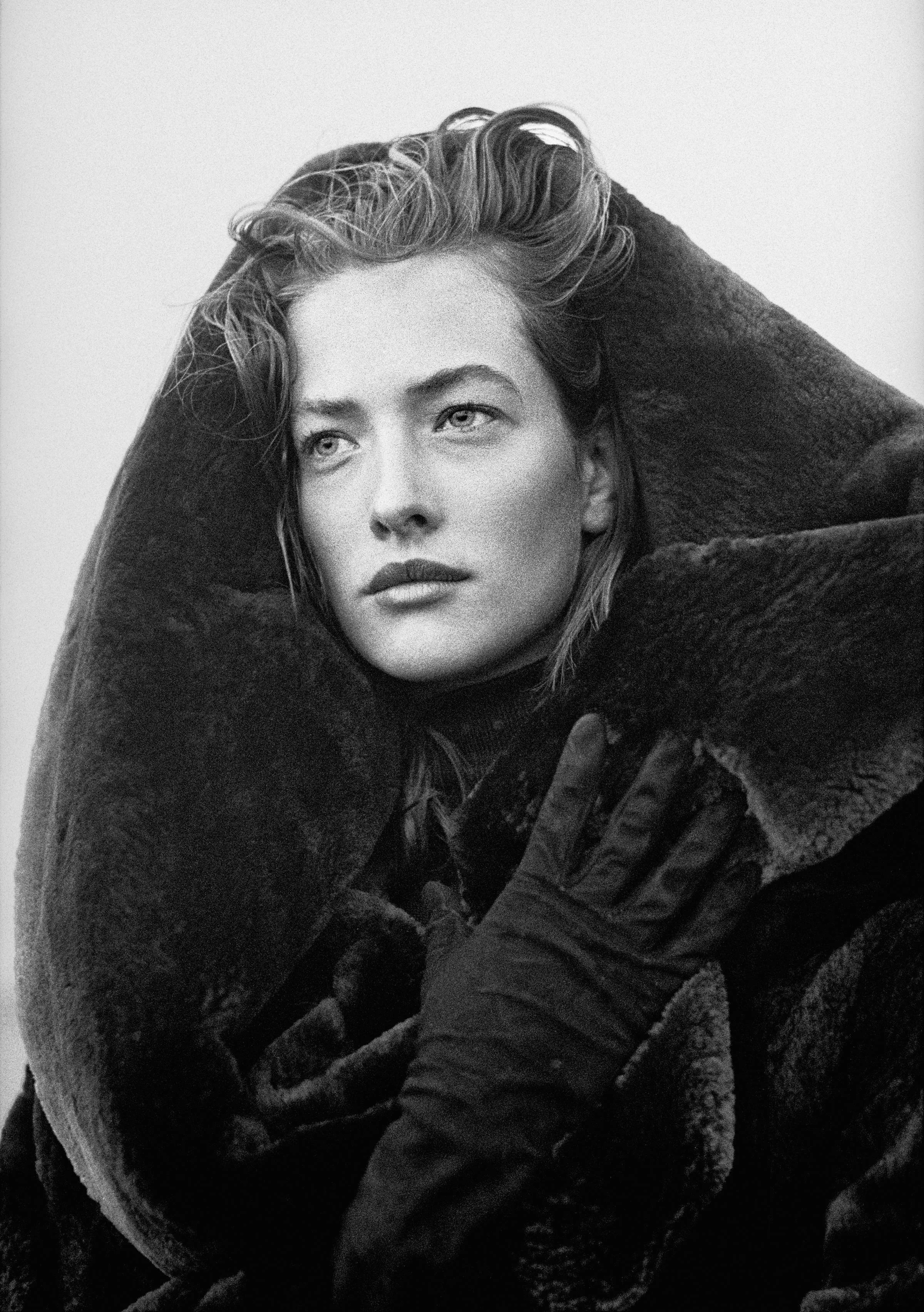 What strikes me about it — and about Lindbergh's work generally from this period — is how little it relies on beauty in the conventional fashion-photography sense. He wasn't lighting Patitz to look flawless. He was lighting her to look present. The grain is visible. The tonal range is compressed into a narrow band of silver and charcoal. There's no retouching softness, no diffusion. Just skin and fur and the flat northern light of the Pas-de-Calais coast.