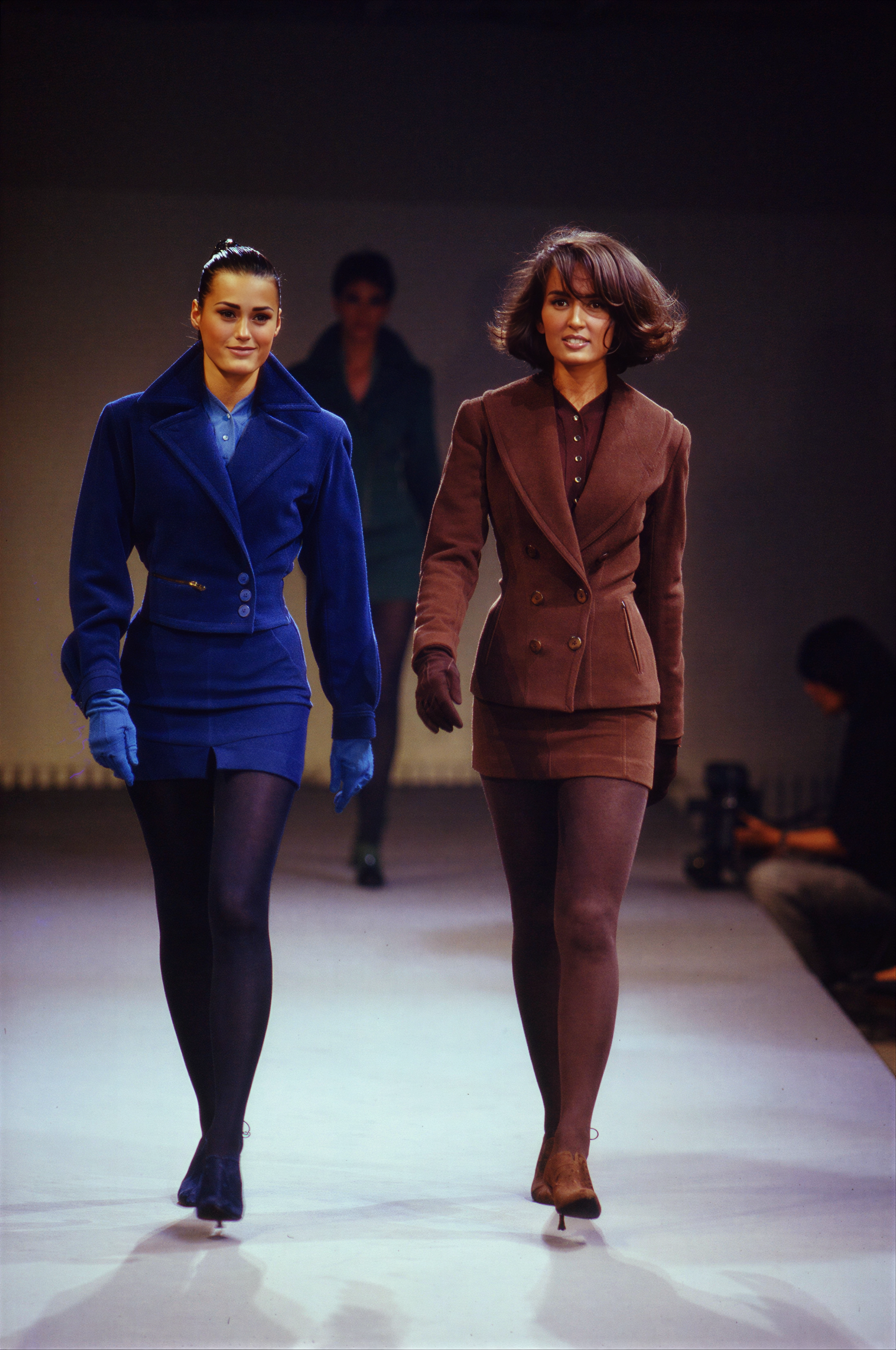 The collection has been described as "sensational workwear" — the workwear codes of the era absorbed and reconstituted through his body-conscious lens. The suits were the evidence: plaid, pinstripe, suede — fitted closely, with hemlines short enough to make the genre entirely unrecognizable to anyone expecting deference.