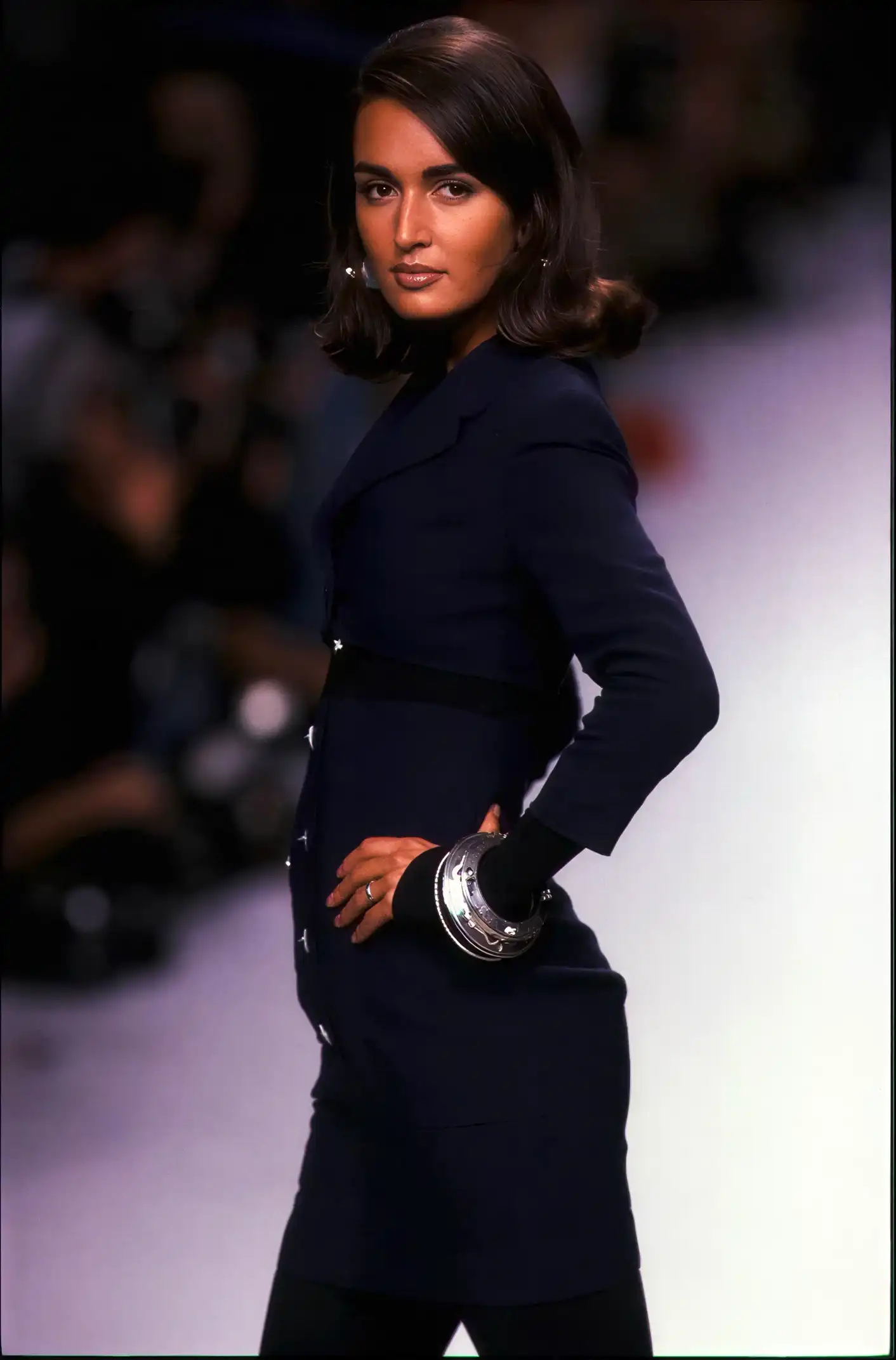 The Chanel Spring 1992 haute couture show was presented in Paris in January of that year, and even now it gets cited more than almost anything else from Lagerfeld's tenure. Most of the citations are for one dress: a slim black silhouette layered with chunky gold-and-glass chain, worn down the runway by Christy Turlington and later, in the long afterlife of fashion images, by Penélope Cruz in Broken Embraces and Lily-Rose Depp at the 2019 Met Gala. The dress was also a brilliant marketing vehicle for Chanel costume jewellery, which was the brand's most profitable category at the time. A Trojan horse with chains.
