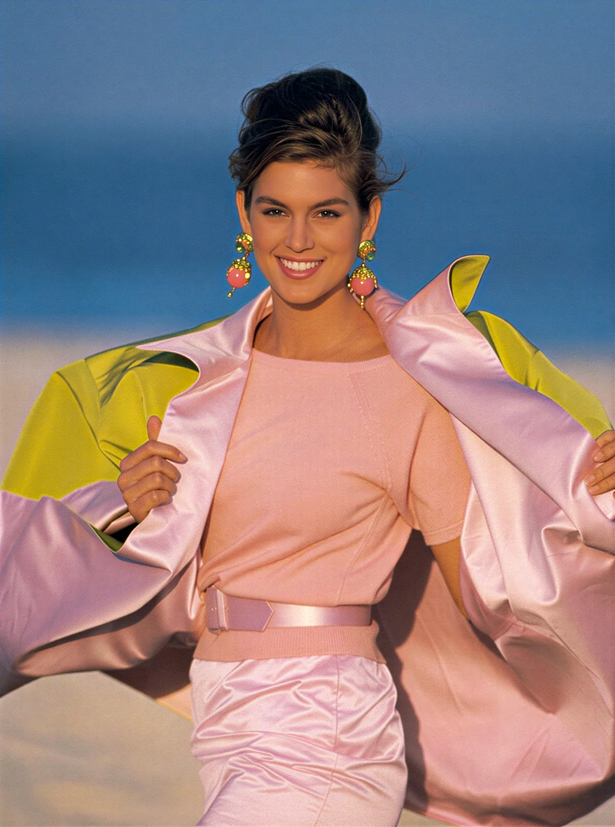 Patrick Demarchelier shot this against nothing but sand and sky. No props, no elaborate set. Just Cindy Crawford in head-to-toe pink Oscar de la Renta, pulling a satin jacket open to show its chartreuse lining, grinning like she already knew what the next decade had in store.