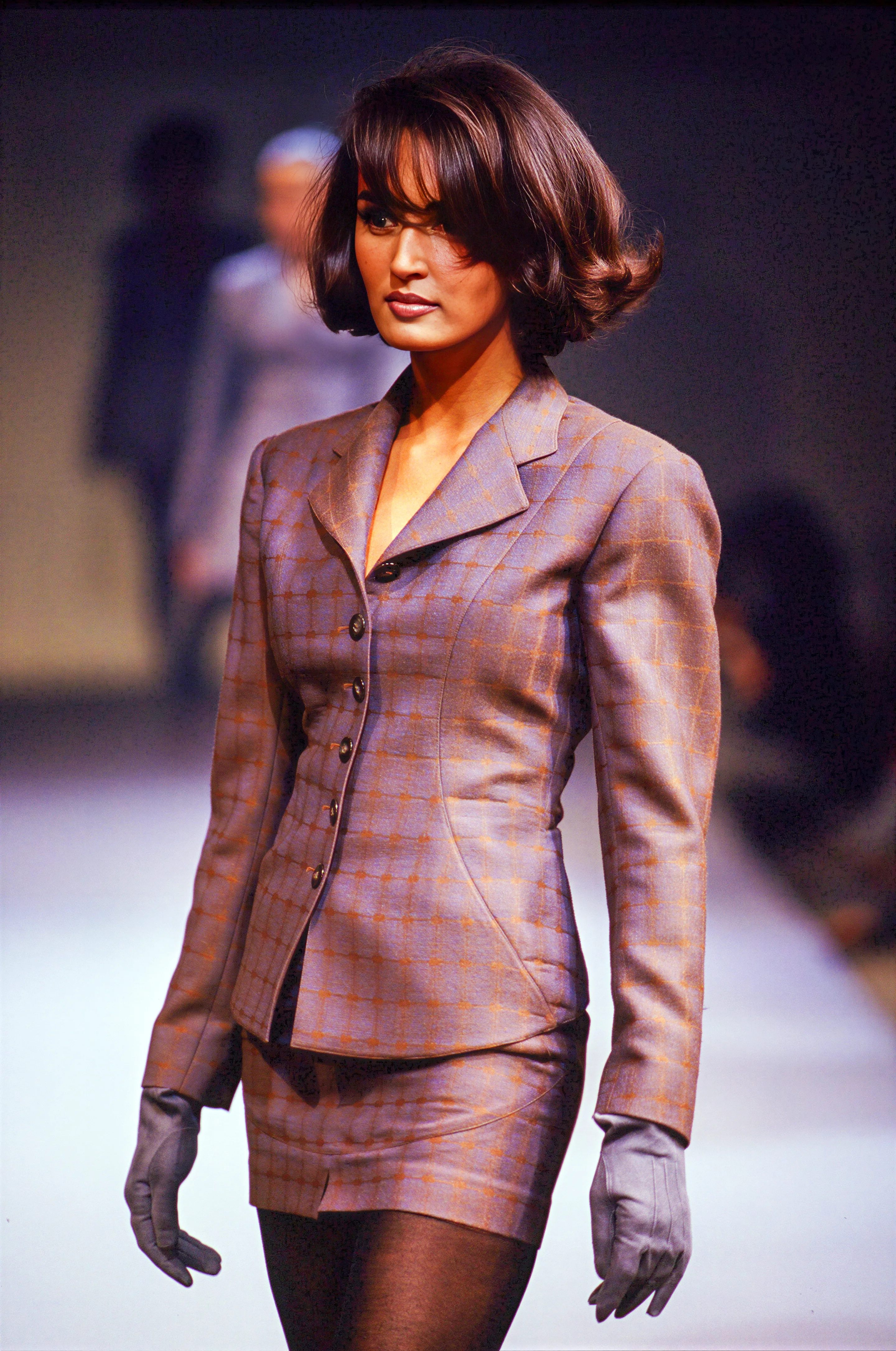 The collection has been described as "sensational workwear" — the workwear codes of the era absorbed and reconstituted through his body-conscious lens. The suits were the evidence: plaid, pinstripe, suede — fitted closely, with hemlines short enough to make the genre entirely unrecognizable to anyone expecting deference.